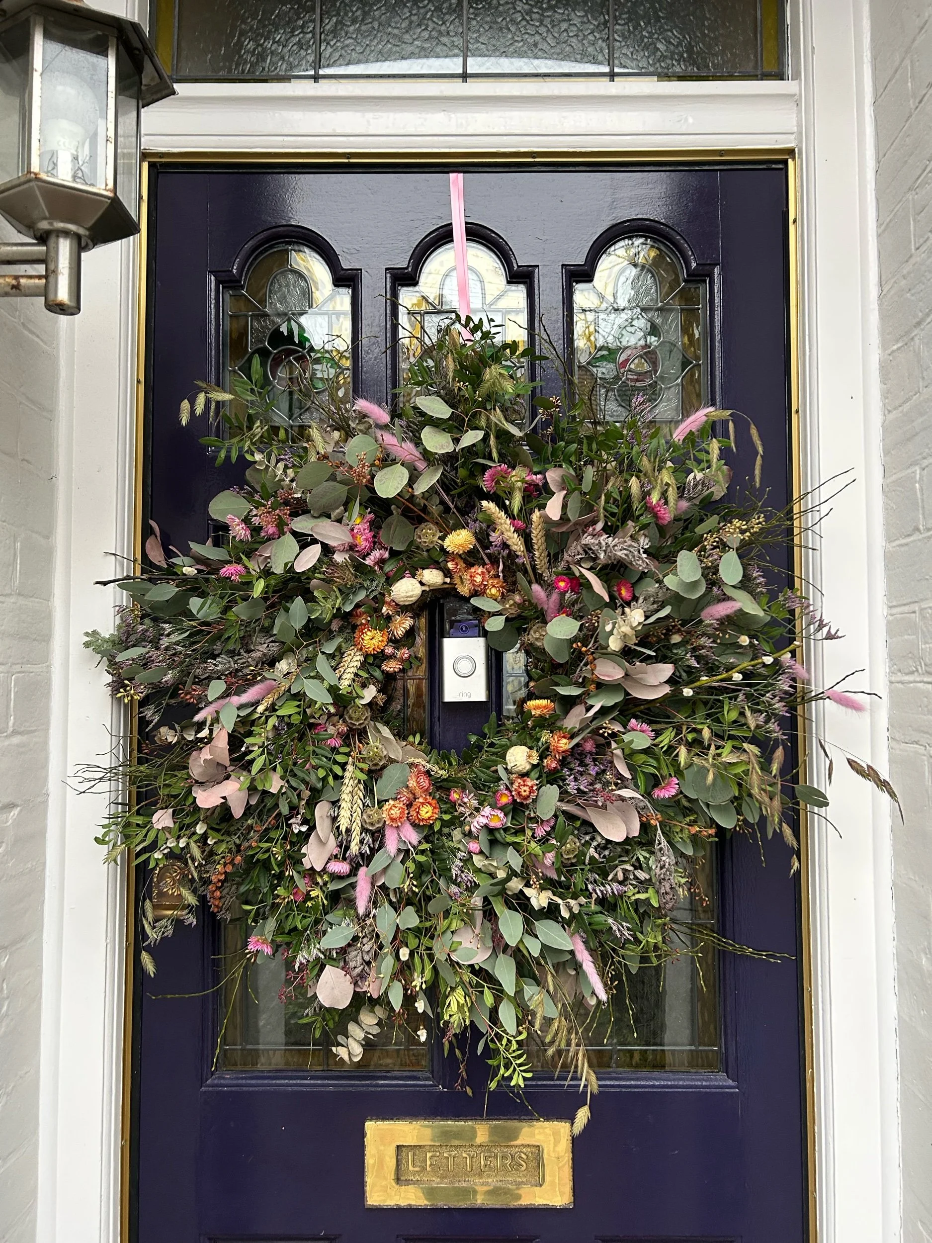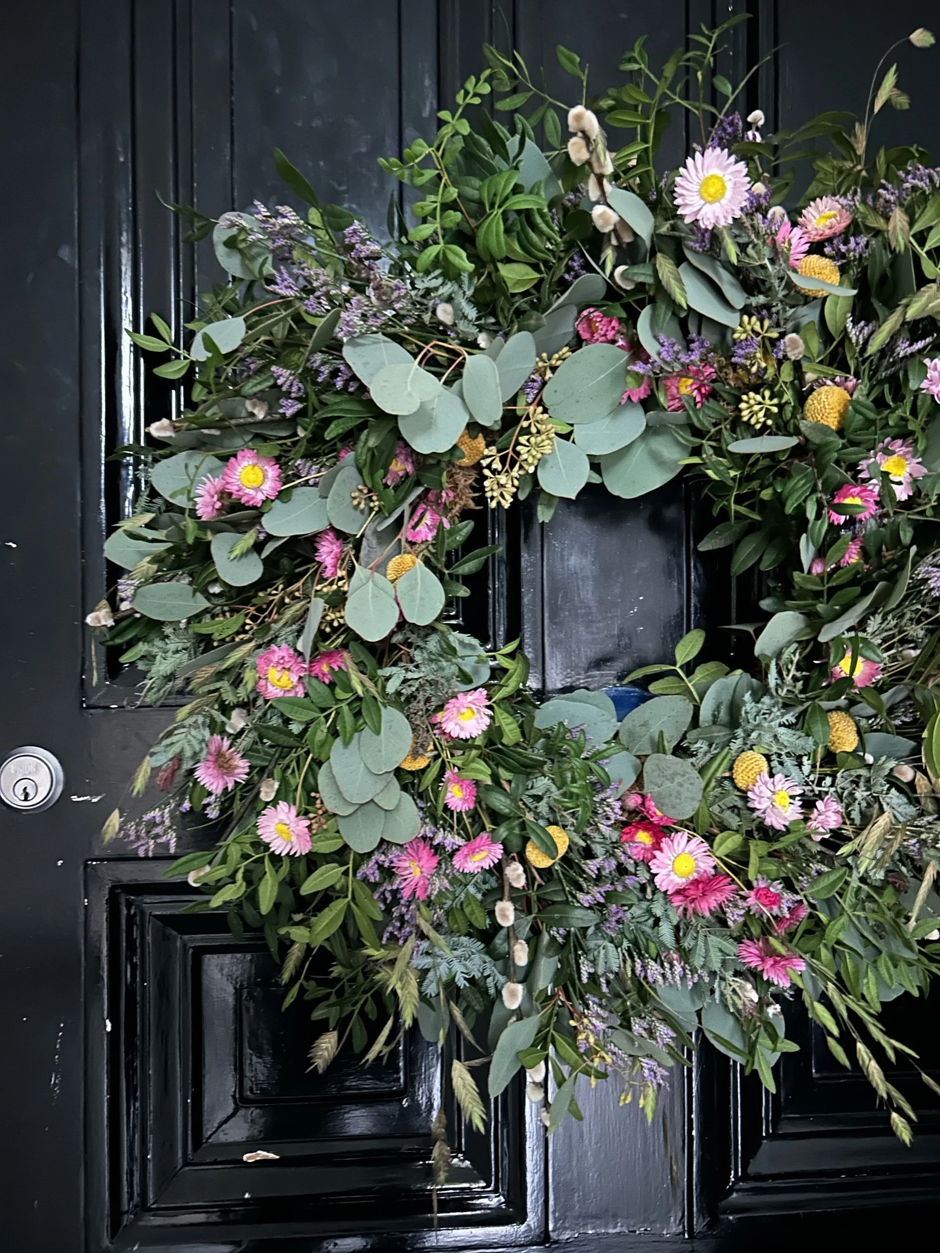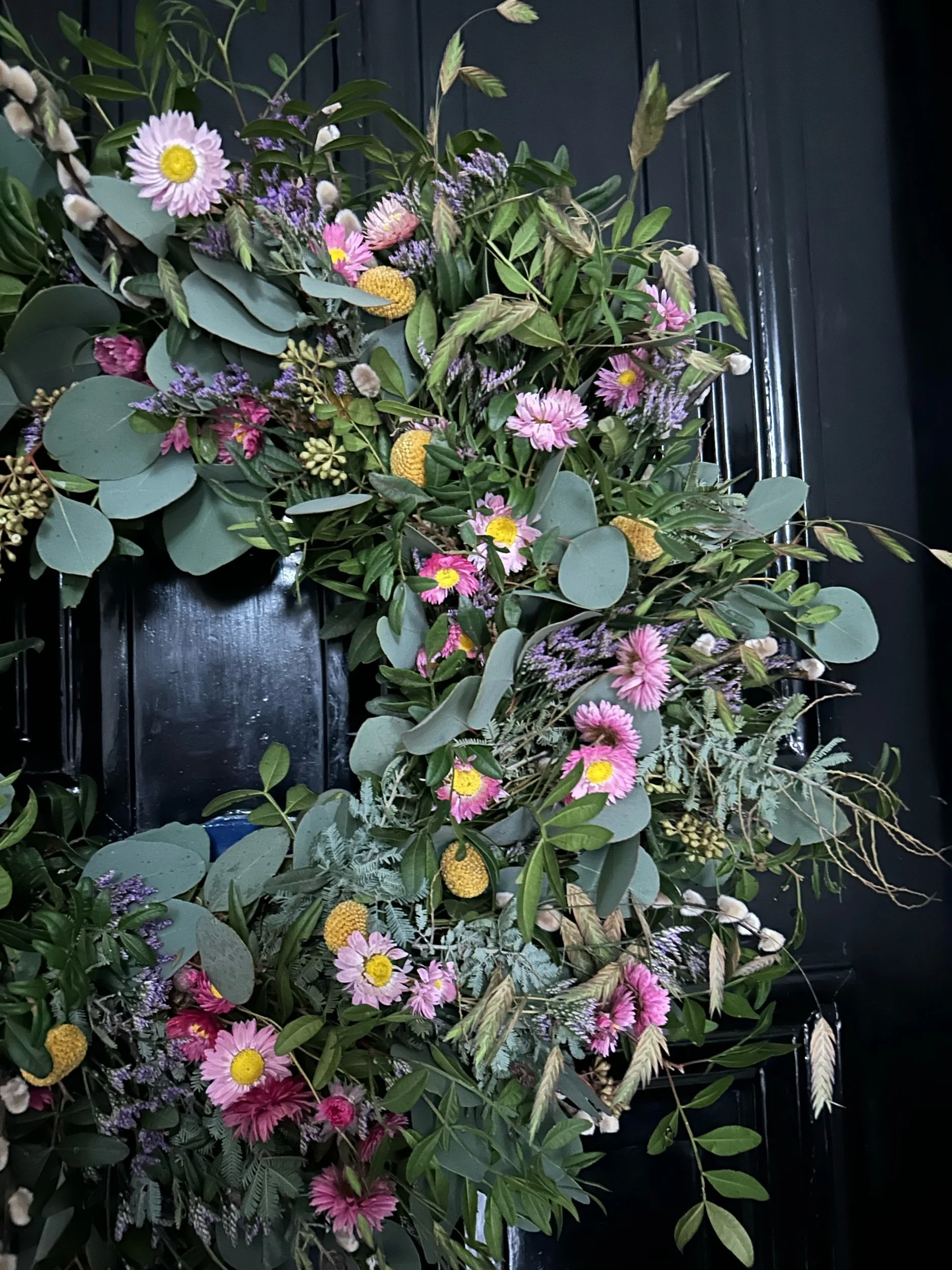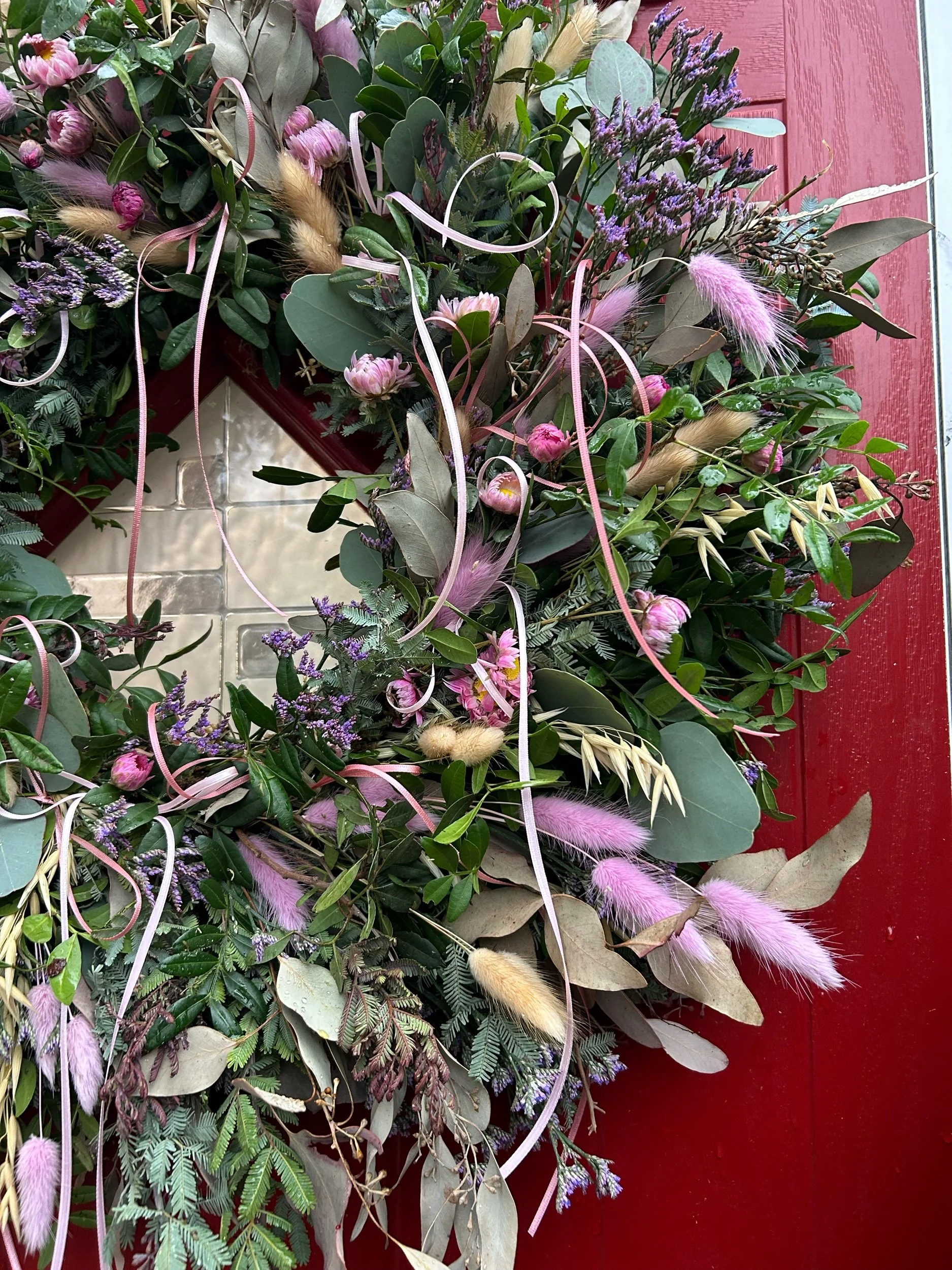 Wreaths inspired by Spring featuring fresh foliages & dried pastel flowers. In 2 sizes.